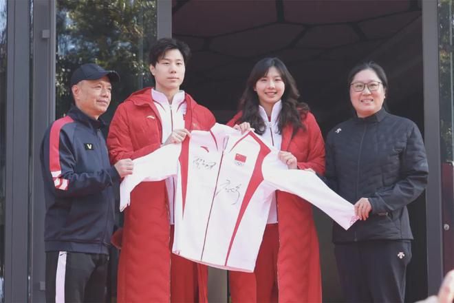 覃海洋、唐錢婷向(xiàng)學校(xiào)贈送簽名寄語服裝,校方回贈校刊創刊號《航(háng)標176》。