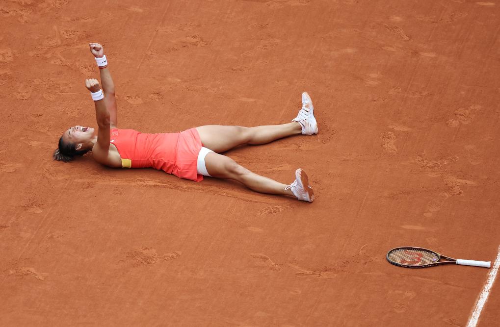 8月3日(rì),鄭欽文在(zài)巴黎奧運會網球女子單打金(jīn)牌賽後慶祝奪冠。新華社記(jì)者(zhě) 高靜 攝