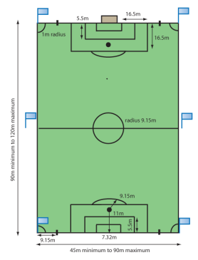 比賽場地可為天然場(chǎng)地或人工場地,但人工場(chǎng)地顏色必(bì)須為綠色。比賽場地應為長方形並帶有標記線(xiàn),所有標記線為同一尺(chǐ)寸,且不得超過12厘(lí)米寬,所有標記線所占據空間為比賽場地內部。兩條較長邊界(jiè)線稱作邊線,兩條較短邊界線稱作端線。比(bǐ)賽(sài)場地由中線(xiàn)分為兩個等麵積(jī)部分,中線為兩邊線中點連線。賽場中心點為中線中點,以中心點為圓心,中點(diǎn)周圍圍繞著半徑為9.15米的環線。 場地為長方形,邊線米,端線米,邊線必須長於端線(xiàn)。國際(jì)A級足球比賽場地為長100米至110米,寬(kuān)64米至75的長方形(xíng)。