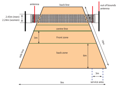 排球場由比賽場區和無障礙區組成。比賽場區的(de)長(zhǎng)度18米,寬(kuān)度9米。可分為兩塊等麵積(9m9m)的區域,比賽的兩隊各於球場(chǎng)的一邊,每一邊又可分為前區(離中線米內的區域)和後區(離中線米(mǐ)的區(qū)域),劃分前區和(hé)後區(qū)的線稱為攻擊線(attack line),男子競賽為中線米的網子(zǐ)(女子競賽則是2.24米);無障礙區,指的是(shì)場地上方不(bú)得有任何障礙物的空間,除寬度(dù)不得小於兩米外沒有其他限(xiàn)製。