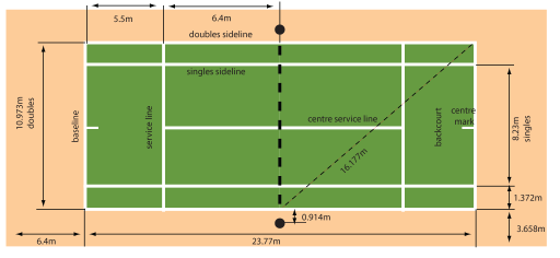 網球比賽在一個長方形的場地上進行。網(wǎng)球場地上用白線英尺)。單打比賽的(de)球場寬度定為8.23米(27英尺),雙打比賽則為10.97米(36英尺)。球場左右兩旁的線;單打邊線;雙打邊線;。球場兩端的白線;底線;。兩(liǎng)條底線的中間標有短小的中(zhōng)界點。球場周圍必須留出(chū)空間。