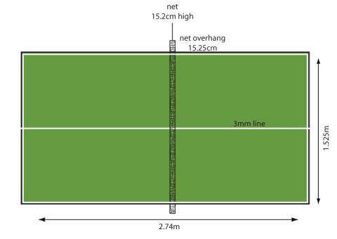 乒乓球比賽球桌(zhuō)台麵(miàn)用高密度纖維板或者類似的加工木料做成,並被(bèi)塗上了一層低摩擦(cā)的專用光滑塗料。 球台的上層表麵叫(jiào)做比賽(sài)台麵,應為與水平麵平行的長方(fāng)形,長274米,寬1.525米 ,高76厘米。比(bǐ)賽台麵應呈均勻的暗色,無光澤,沿每個2.74米(mǐ)的比賽合(hé)麵邊緣各有一條2厘米寬的白色邊(biān)線米(mǐ)的比賽台麵邊緣各有一條2厘米寬的白色端線。比賽台(tái)麵由一個與端線平行的垂直的球網劃分為兩個相等的台區.