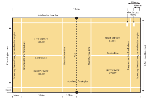標準的羽毛球(qiú)場為(wéi)長方形,長度13.4米,寬度6.1米,天花板的高度應大於6.1米。羽毛(máo)球場的網柱必須固定在地麵上,有效高度為1.55米。球網(wǎng)頂(dǐng)部至地麵的高度為1.524米。場(chǎng)地(dì)線毫米,須用白色或(huò)黃色的顏料畫出,並在球場的(de)邊線米以上的安(ān)全空間。羽毛球球網用深色纖維製成(chéng),網孔大小15~20毫米,球網長6.10米,寬0.76米。