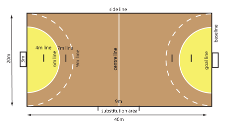 球門區(六米區):除守方的守門員外,其他球員不得進入,此線離門(mén)六米,故稱其為六米區。(打門(mén)後順勢衝入者例外),九米(mǐ)罰(fá)球進行時,防守球員需緊貼此線。