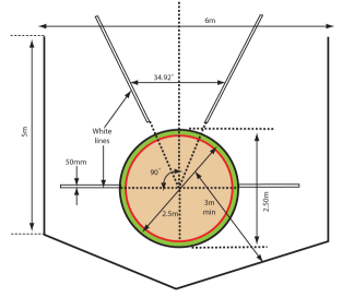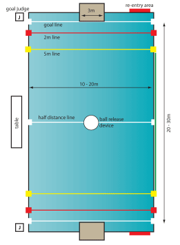 球場(chǎng)最(zuì)大為20米寬,30米長,球場的邊緣上有各種不同的(de)顏色標誌著重要的線:中線是白色的,七米線是綠色的,四米線是(shì)黃色的,兩米線是紅(hóng)色的。球場的兩端是球門,球門寬3米,高90厘米。球場的深度不限(xiàn)。但一般要(yào)求(qiú)大多數運動員不能在水(shuǐ)中站立。在水中持(chí)球站立或跳躍或雙手持球和封截打門同屬犯規(guī),對方運動(dòng)員在這種情況下得球。