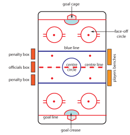 標準冰球場地最大規格為長61米,寬30米;最小規格為長56米,寬26米;四角圓孤的半徑為7~8.5米。國(guó)際比賽均采用長61米、寬30米、角圓弧半徑為8.5米的場地。冰球場地四周圍以高1.15米~1.22米木(mù)質或可塑材料製成的牢固界牆。除場地正式標記外,全(quán)部冰麵和界牆(qiáng)內壁應為白色。