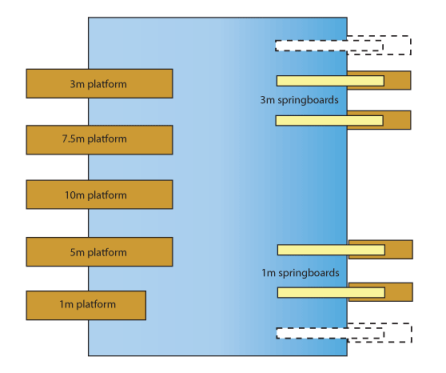 即(jí)距水麵的距離誤差也是不得超過5%,台麵至少要長6米,寬2米,台麵(miàn)要防滑,前端要(yào)伸出池內1.5米,台座要縮入池沿(yán)1.5米,在距離台前端垂直線範圍內不(bú)得有任何障礙物,水深至少要達到(dào)4.5米(mǐ)。