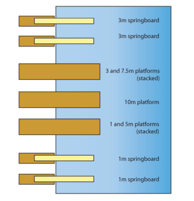 跳(tiào)板所謂1米(mǐ)或3米是(shì)指板麵距離水麵(miàn)的距離,誤差不(bú)得超過5%,板麵寬(kuān)為(wéi)50厘米,長為4米,板麵必須防滑,板(bǎn)麵應與水麵平行,角度誤差不得超過1度。(奧運會、世界錦標賽和(hé)世界杯賽隻有3米跳板(bǎn)及10米高台。)