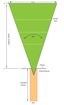 運動員在拿標槍(qiāng)和投擲標槍時,必須將標槍舉過其肩部和膀臂的上方。此外,運(yùn)動員在投擲(zhì)時禁止將其背部轉向投擲方(fāng)向(xiàng)。擲標槍的範圍(wéi)並不是像擲鏈球那樣被局限在一個圈裏,運(yùn)動員有一個4米寬,30米長的跑道(dào)以供助跑(pǎo)。運動員一般在這個(gè)區域(yù)獲得了一定(dìng)速度後才將標(biāo)槍擲出。如同其他比賽一樣,在完成一擲(zhì)(標(biāo)槍落地)(implement lands)以前(qián),運動員是不(bú)得離開投擲區的。在投擲時,運動員不得超過遠(yuǎn)端的投擲區終點(diǎn),這也意味著運動員必(bì)須在到達終點前達到最快速度。標槍的投擲區是(shì)一塊從跑道末端以29度角向外延展到外弧的區域。規(guī)則規定,隻有標槍(qiāng)完全被投擲到到規定範(fàn)圍內才能作(zuò)為成績,如果投(tóu)擲(zhì)到(dào)範圍以外(wài)的話則不算成績。丈量成績從標槍的最近落點開始,並且必須(xū)是標槍頭首先著地才能算作成績。比賽(sài)過程與其他投擲(zhì)項目類似,比賽一般由3到6輪構成。結束前三輪比賽後,按成(chéng)績提取(qǔ)前8名(míng)運(yùn)動員參加最後三輪的比賽,第四、五輪比賽(sài)排序按前三(sān)輪(lún)成績的倒(dǎo)序(xù)排列,第六輪比賽排序則按前五輪(lún)成績的倒序排列(liè),成績最好的在最後投擲。最終,誰投擲的最(zuì)遠誰(shuí)獲(huò)得第一名。每位運(yùn)動員如果想改善(shàn)自己的(de)成績的話,隻能在其他輪中嚐(cháng)試了。