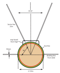 比賽場地是一個直角扇形區域,直角兩邊是區分界內陸區和界外地區(qū)的邊線。兩邊線以(yǐ)內為(wéi)界內陸區;兩邊線以外為界(jiè)外地區。界內和界外地區都是比賽(sài)有效地區。界內陸區又分為內場和外場。內場呈正方形,四角各設(shè)一個壘位,在同一水平麵上在尖(jiān)角上的壘位是本壘,並依反時針方向(xiàng)分別為一壘、二壘和三壘。內場以外(wài)的地區為外場。比賽場地必須平整,不得有任何障礙物。內場每邊壘間距離為27.43米。投手板的前沿中(zhōng)心和本壘尖角的距離為18.44米。本壘後(hòu)麵和兩(liǎng)邊線米(mǐ)的範(fàn)圍內為界外的有效比賽地區。兩邊線米。兩邊線頂端連結線的任何一點距本壘尖角的距離都不應少於76.20米。本壘尖角後18.29米處應設置後擋網。網高(gāo)4米以上,長20米以上。場地周圍設置圍網,高度1米以(yǐ)上為宜。