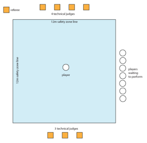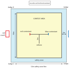 跆拳道的比賽場地是長8米、寬(kuān)8米的水(shuǐ)平的、無障礙物的正方形場地(dì)。場地的地(dì)麵應為有彈性的墊子(zǐ)。場地中央長8米、寬8米的區域為比賽區,其餘(yú)部分為警戒區。警戒區和比(bǐ)賽區表麵用兩種(zhǒng)不同顏色劃分,同色時用5厘米寬的白(bái)線劃分(fèn)。