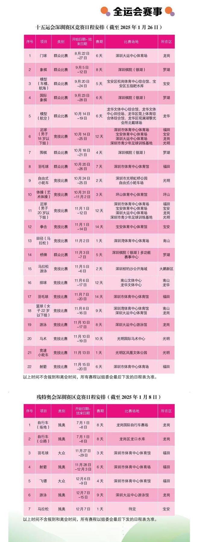 近日,深視體育發布《2025深圳重點賽事100名冊》。根據名冊信息顯示,十五(wǔ)屆全運會深圳賽區競賽日程安排,田徑(馬拉鬆)項目11月2日舉行,賽期為期1天。