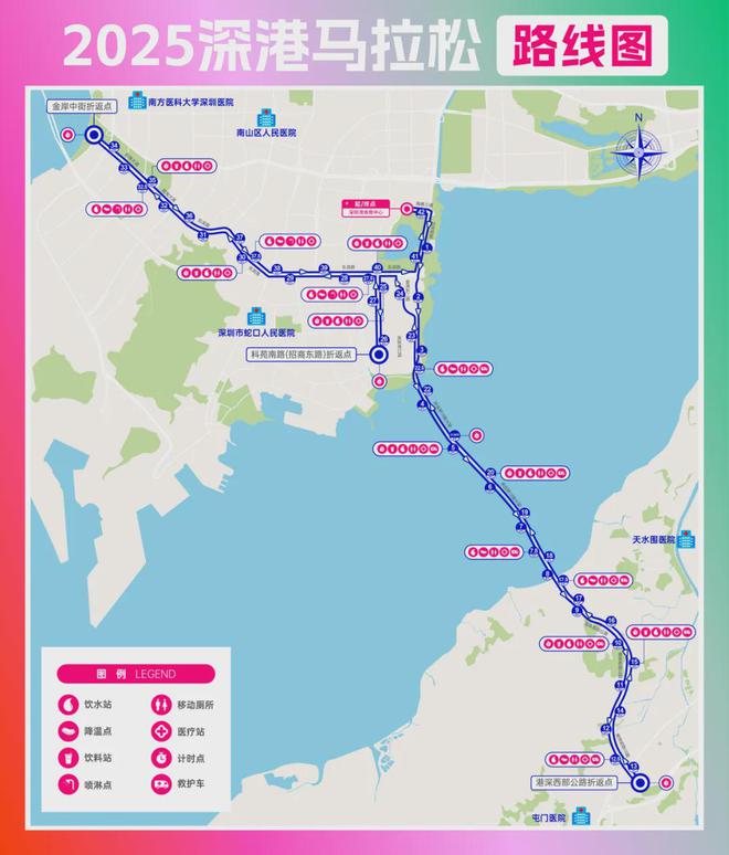 深圳灣體育中心(海德三道-起點)→沙河西路(順行)→望(wàng)海路(順行)→深(shēn)圳灣(wān)口岸(客運(yùn)深方入口)→深圳灣公路大橋(逆行)→港深西部公路(逆行)→港深西部公路立交橋(第一折返點)→港(gǎng)深西(xī)部公路(逆行)→深圳灣公路大 橋(逆行)→深圳灣口岸(客運(yùn)深方出口)→金灣(wān)東二路→東濱路(lù)(逆行)→科苑南路(逆行(háng))→招商東路(第二折返點)→科苑南路(逆行)→東濱路(逆行)→前海大道(逆行)→前海石公園(第三折返點)→前海大道(逆行)→東濱路(逆行)→沙河西路(逆行)→海德三道(逆行)→深圳(zhèn)灣體(tǐ)育中心(海德三 道-終點(diǎn))最終路(lù)線以中國田徑協會(huì)丈量為準。
